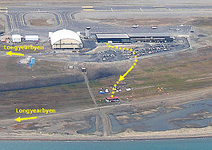 Distance from the campsite to the center of Longyearbyen is about 4 km (2.5 miles). The tarmac airport road and the gravel coastal road meet a few hundred metres to the left (East) outside the picture. From there, you follow the tarmac road along the shore towards the already visible settlement, \you can do this either on foot, on a rental bike, using one of the airport busses (operating only in connection with flights), or by taxi or rental. In summer and with good visibility, the shore road is reasonably safe also without a gun.